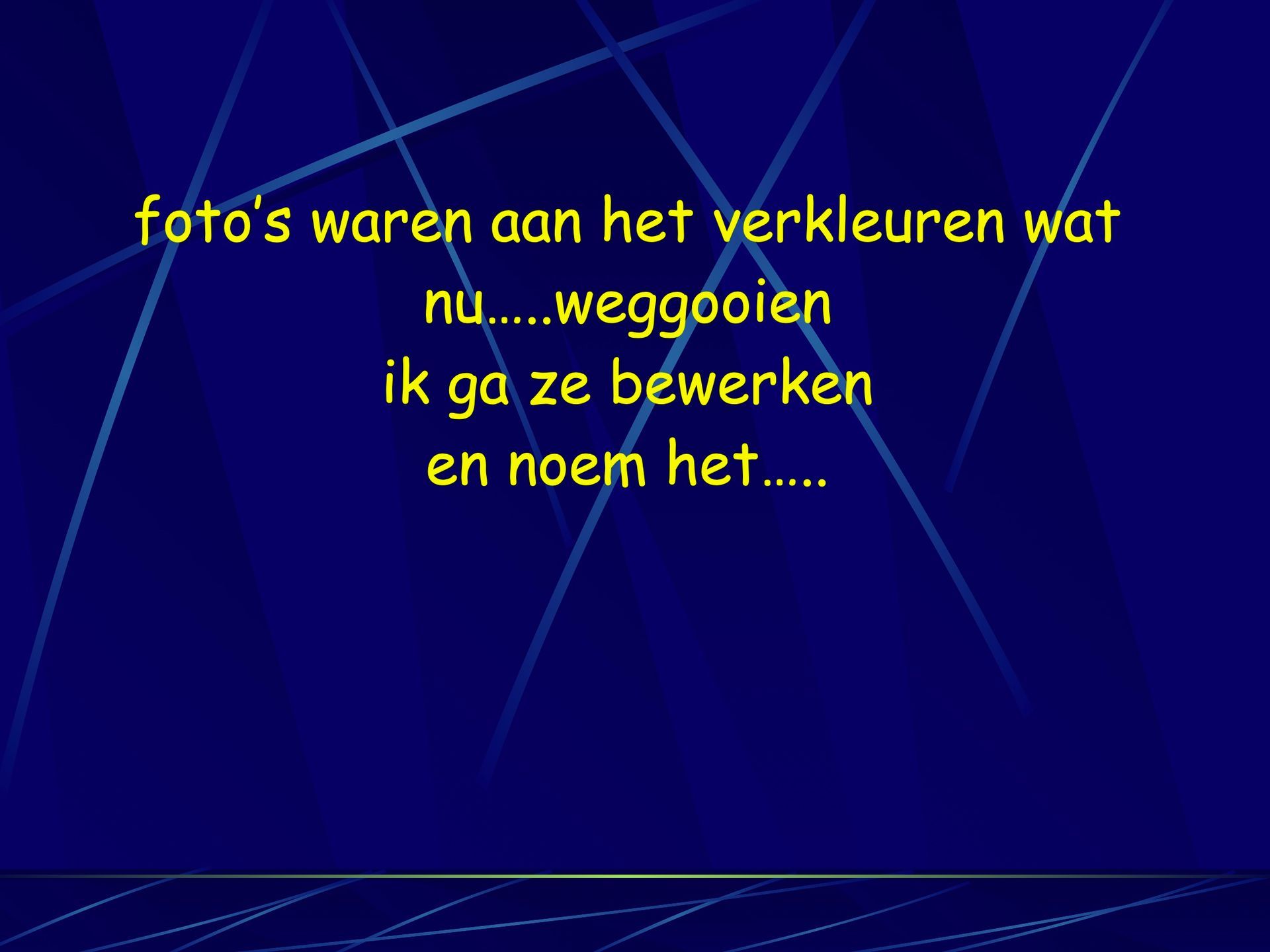 Tijdens een workshop Fotografie in het Museum van Hilversum door Raymond Rutting werden fotografen in de gelegenheid gesteld hun werk te presenteren. Gedurende 10 minuten kreeg ik de gelegenheid mijn fotowerk nader toe te lichten. Dit werk bestond niet zozeer uit foto's van diverse onderwerpen, maar uit bewerkt beeldmateriaal met een voor mij onbekende techniek. Voorafgaand aan de presentatie had ik al enkele beelden klaar gezet om het tastbaar en zichtbaar te maken.